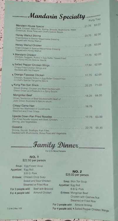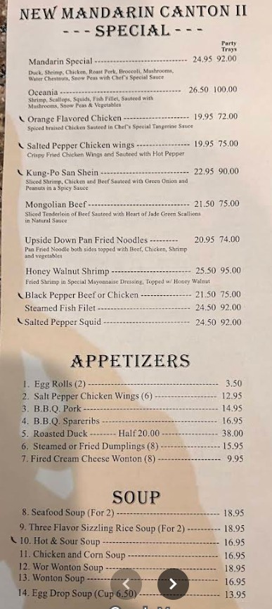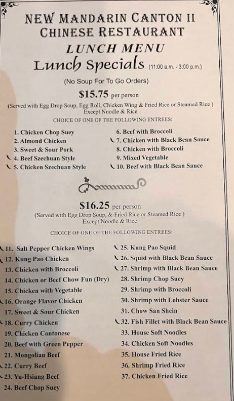 Welcome to the New Mandarin Canton Chinese Restaurant menu, your complete guide to authentic Chinese dining in Chula Vista. Known for its flavorful Cantonese-style cuisine and generous portions, this restaurant offers a wide variety of dishes including classic appetizers, savory noodle and rice dishes, fresh seafood, and signature house specialties. The New Mandarin Canton Chinese Restaurant menu is crafted to suit every taste, whether you’re craving traditional comfort food or bold Asian flavors. On this page, you can explore the latest menu with updated prices, discover popular items, and plan your dining experience with ease.